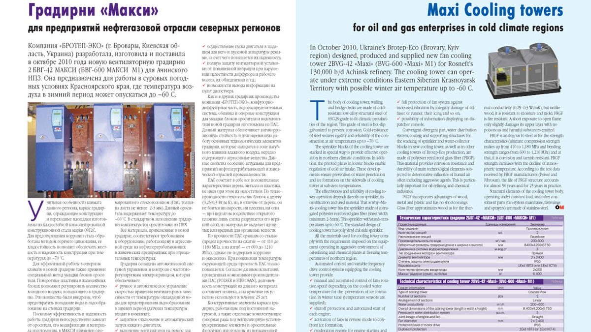 Модельний ряд блокових вентиляторних градирень виробництва АТ «БРОТЕП-ЕКО» поповнився новими розробками. У 2010 році для Ачинського нафтопереробного заводу була розроблена, виготовлена і поставлена вентиляторная градирня 2БВГ-42 «МАКСІ» (БВГ-600 «МАКСІ» М1) призначена для роботи в суворих умовах Красноярського краю, де температура повітря в зимовий період може опускатися до -60 ° С.